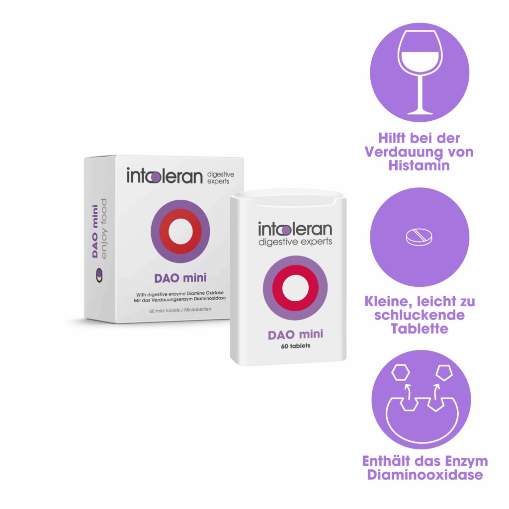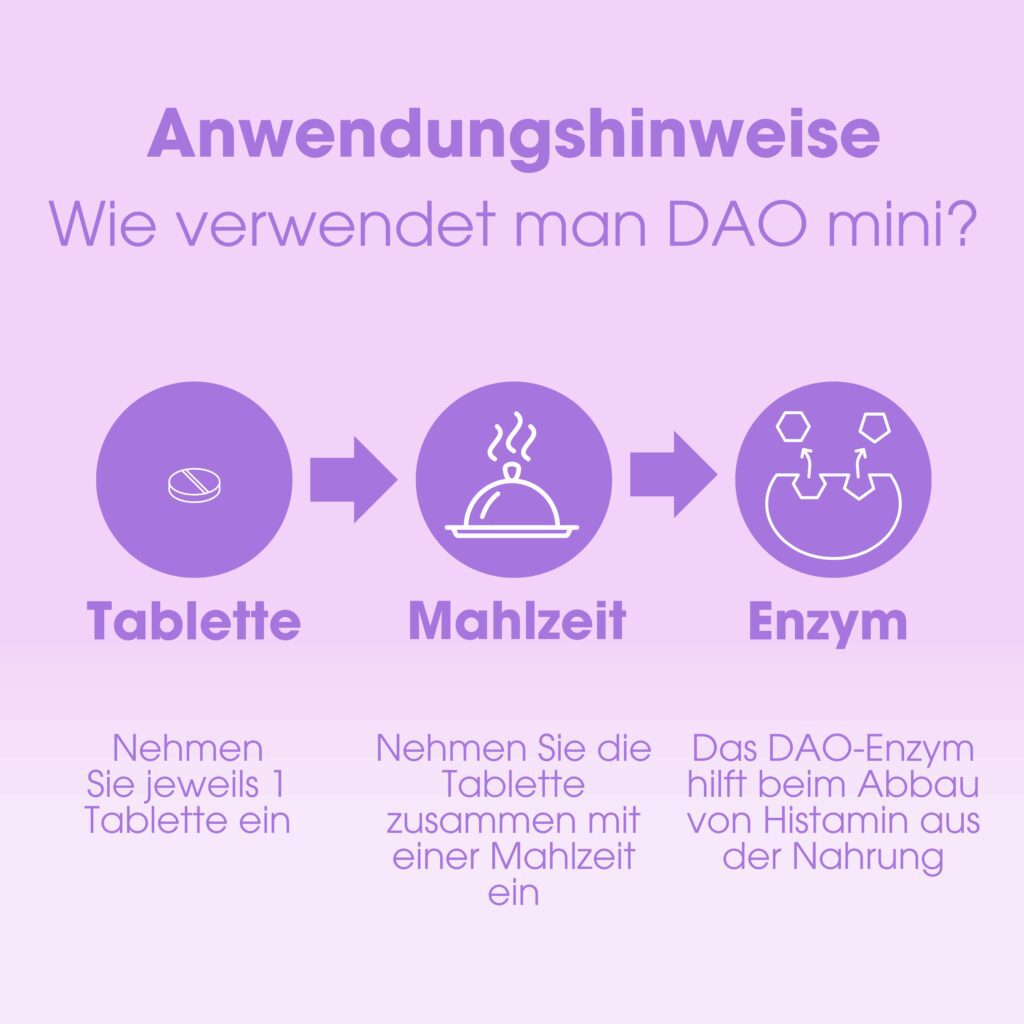 Bei der Anwendung von DAO ist es wichtig, zunächst den Histaminspiegel zu senken. Wir empfehlen eine histaminarme Ernährung (vorzugsweise unter Anleitung eines Ernährungsberaters) in Kombination mit der Einnahme von DAO dreimal täglich (zum Frühstück, Mittag- und Abendessen). Nach zwei bis vier Wochen sollte der Histaminspiegel gesunken sein. Danach können Sie langsam damit beginnen, Histamin wieder in Ihre Ernährung aufzunehmen und/oder die DAO-Supplementierung zu reduzieren, je nach Ihrer persönlichen Situation.