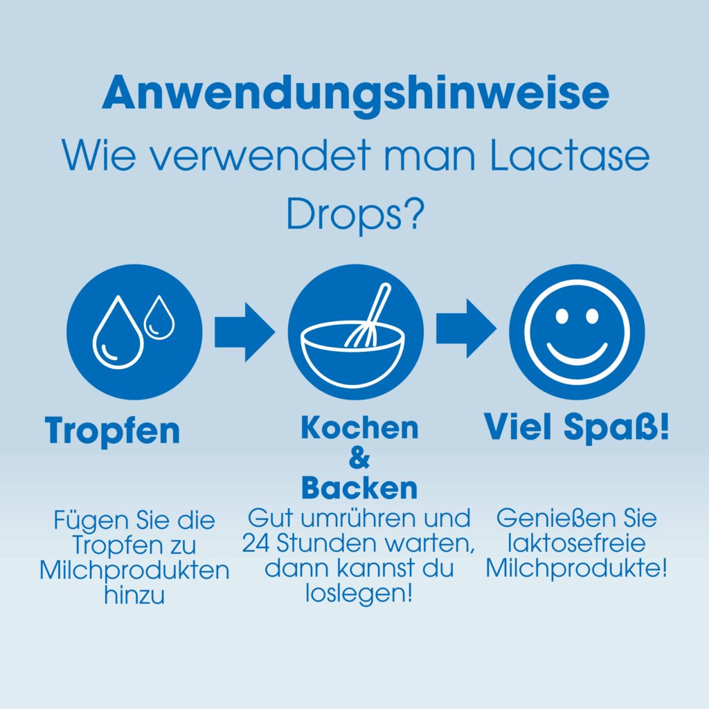 Anwendung: Rühren Sie die Tropfen gut in das Produkt ein und lassen Sie es anschließend 24 Stunden im Kühlschrank stehen. Danach sind mindestens 80 % der Laktose abgebaut. Möchten Sie das Produkt sofort verwenden, ohne zu warten? Dann fügen Sie 5-10 Tropfen pro 120 ml Milchprodukt hinzu.