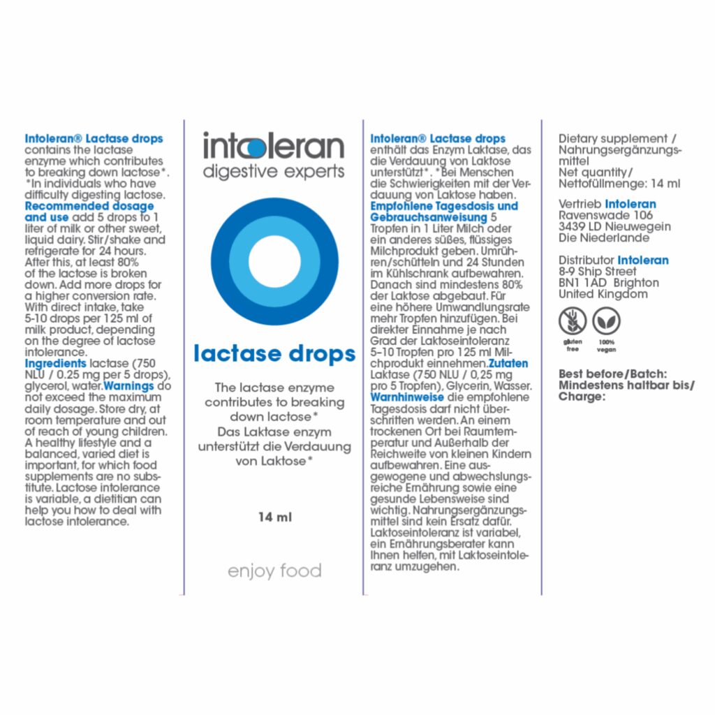 Lactase Drops 14 ml enthält das Enzym Lactase in flüssiger Form (750 NLU Lactase pro 5 Tropfen). In flüssiger Form eignet es sich perfekt, um Milch und Milchprodukte für Menschen mit Laktoseintoleranz* verträglich zu machen. So wird laktosefreies Kochen und Backen viel einfacher! Laktase-Tropfen sind für alle Altersgruppen geeignet.