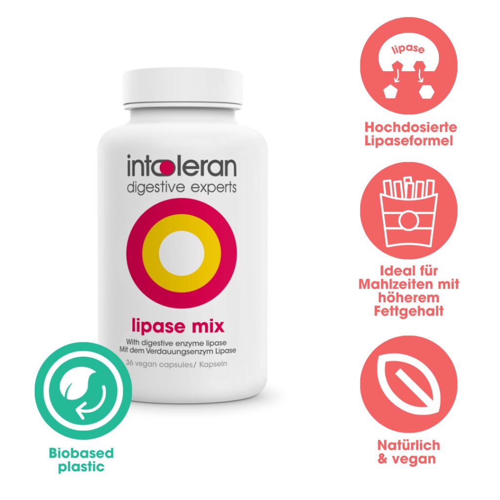 Lipase ist ein Enzym, das bei der Verdauung von Fetten hilft. Lipase Mix enthält eine hohe Dosis Lipase und wurde speziell für den Verzehr fettreicher Mahlzeiten entwickelt. Während der Verdauung wirken Galle und Lipase zusammen. Die Galle zerlegt Fette in kleine Tröpfchen, wodurch die Lipase effektiv wirken kann.