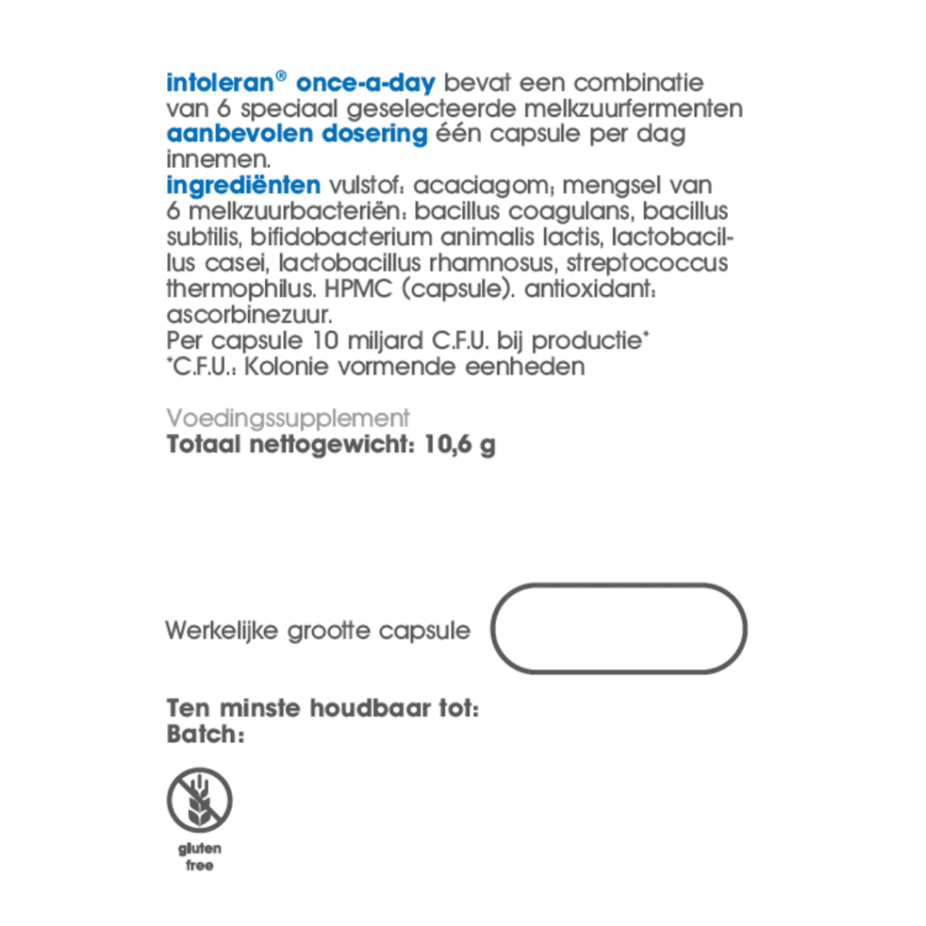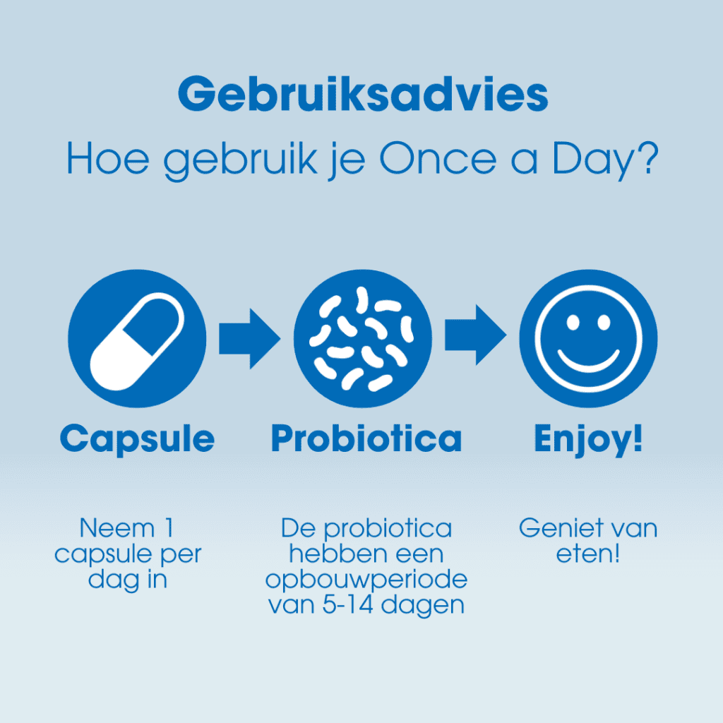 Once a Day ist ein probiotisches Ergänzungsmittel mit 6 speziell ausgewählten probiotischen Stämmen, die zusammen 10 Milliarden lebende Bakterien pro Kapsel enthalten. Once a Day hilft bei der Verdauung von FODMAP-Laktose, die unter anderem in Milch, Käse und anderen Milchprodukten enthalten ist. Mit nur einer Kapsel pro Tag ist Once a Day ideal für die Einnahme im Urlaub, für Kinder geeignet und perfekt für die Langzeiteinnahme.