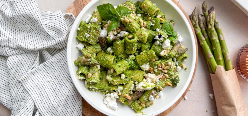 Am 1. April beginnt die Spargelsaison, Zeit also, die Saison mit einer supergesunden Pasta einzuleiten. Dieses Rezept ist nämlich vollgepackt mit Gemüse!