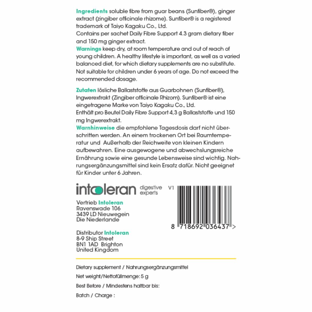 Intoleran Daily Fibre Support contains prebiotic guar bean fiber from the SunFiber® brand.