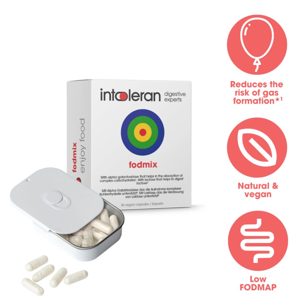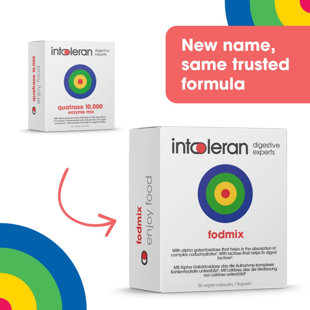 Fodmix (Formerly Quatrase 10.000) contains capsules with a special, high-dosed blend of digestive enzymes that helps in the breakdown of hard-to-digest carbohydrates and sugars (FODMAPs).Our products are developed with great care and attention by our in-house dietitians. For the composition of our products, we use only the necessary ingredients, therefore our products are pure, free of gluten and soy, and of high quality. Fodmix (Formerly Quatrase 10.000) is Low FODMAP Certified™ by Monash University.