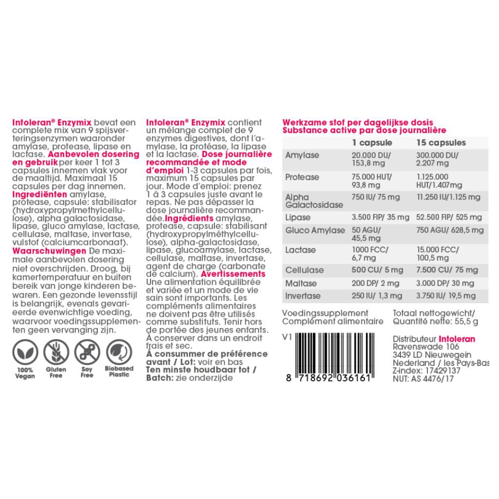 Ingrédients : Amylase (20 000 DU), protéase (75 000 HUT), capsule : stabilisant (hydroxypropylméthylcellulose), alpha-galactosidase (750 UI), lipase (3 500 FIP), gluco amylase (50 AGU), lactase (1 000 FCC), cellulase (500 CU), maltase (200 DP), invertase (250 UI), agent de charge (carbonate de calcium).