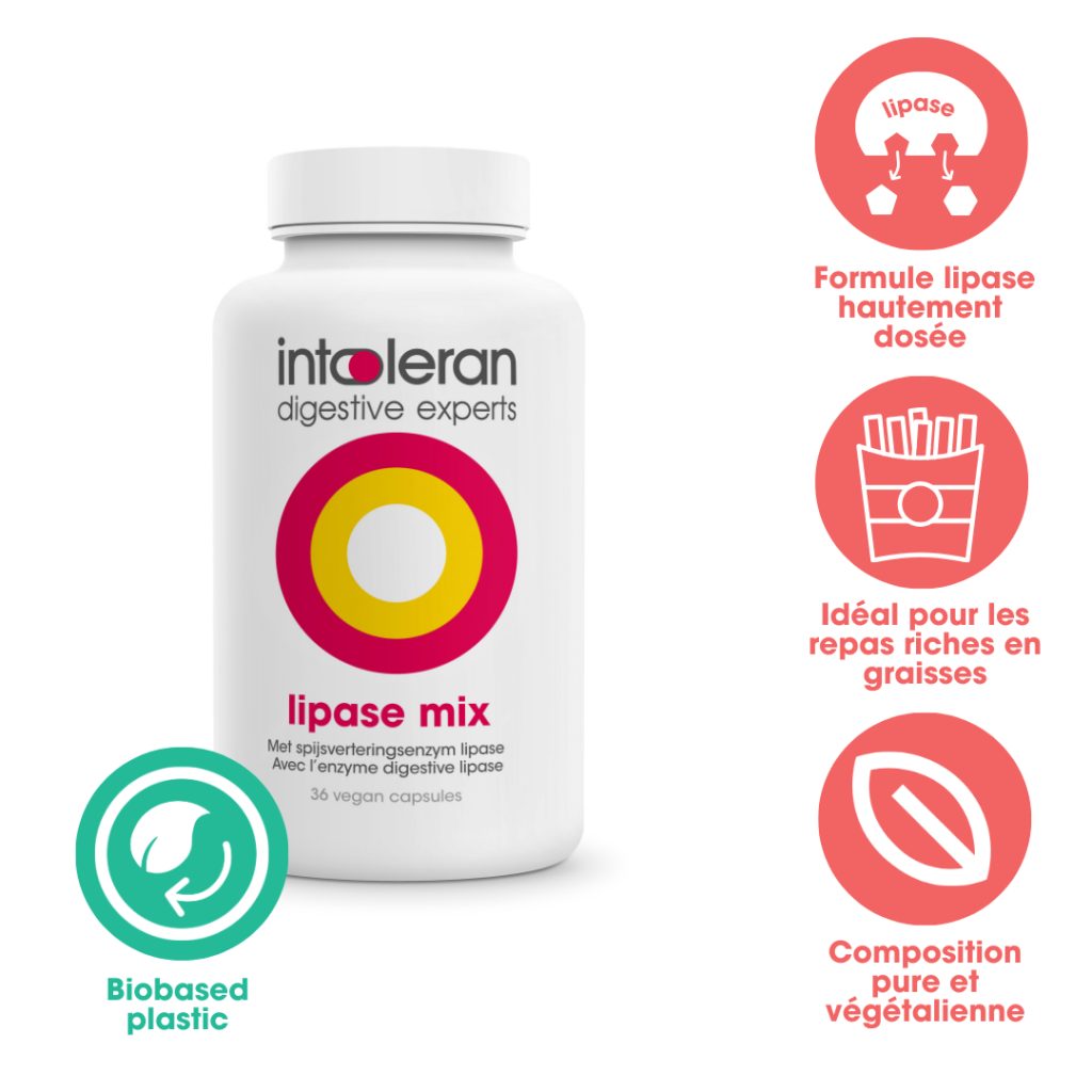 La lipase est une enzyme qui aide à la digestion des graisses. Lipase Mix contient une forte dose de lipase et a été spécialement développé pour être utilisé lors de repas riches en graisses. Pendant la digestion, la bile et la lipase agissent ensemble. La bile divise les graisses en petites gouttelettes, ce qui permet à la lipase d’agir efficacement.
