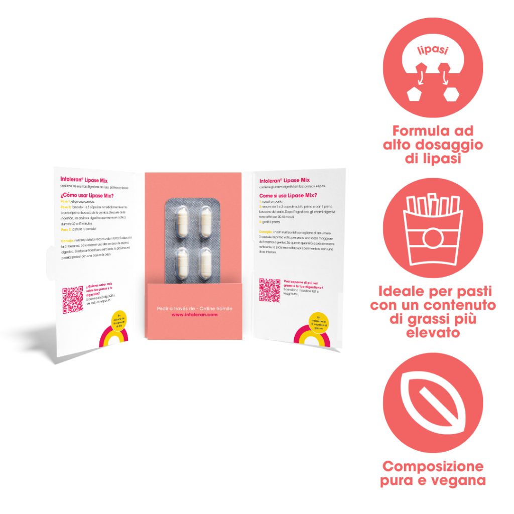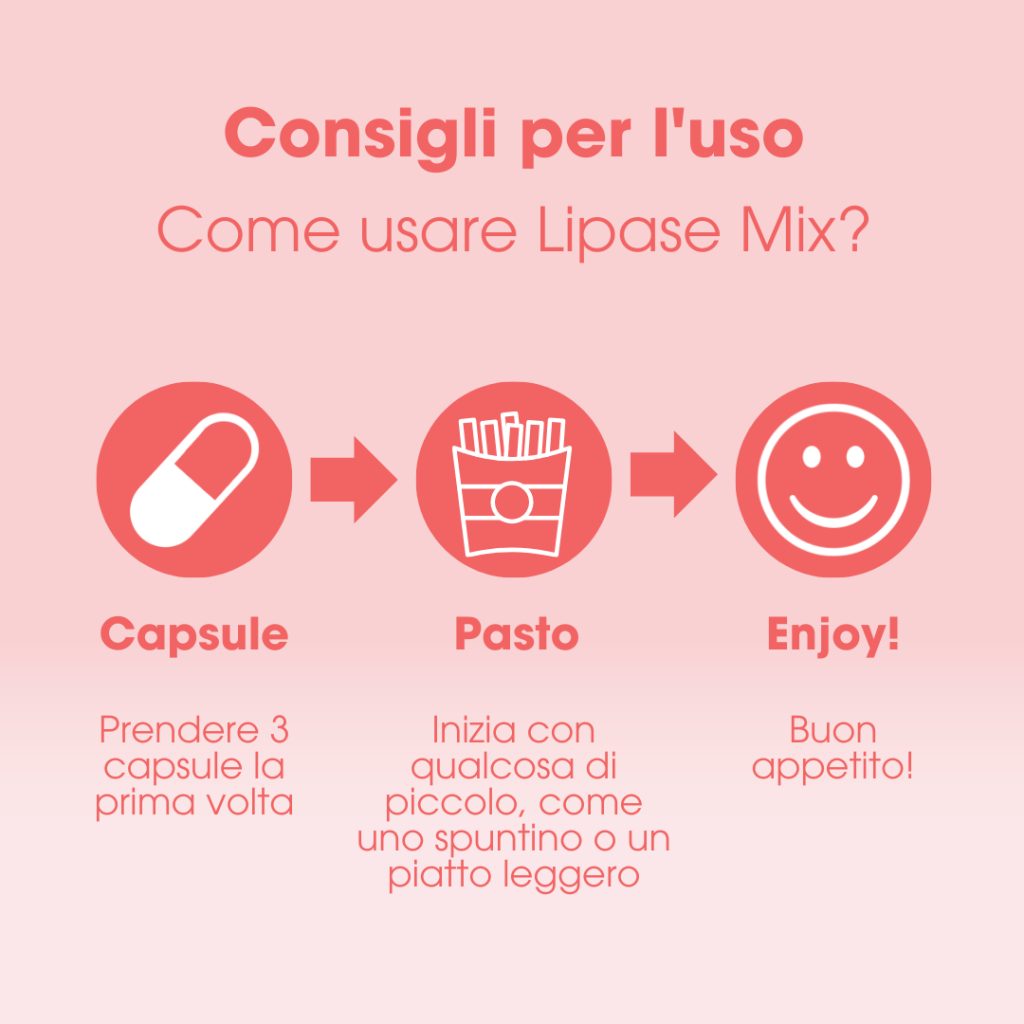 Grazie alla combinazione di più enzimi, Lipase Mix è adatto a pasti che contengono più nutrienti contemporaneamente. Si pensi a piatti come pizza o lasagne (grassi, carboidrati e proteine), frutta a guscio e formaggio (proteine e grassi) o cioccolato e dolci (grassi e carboidrati).