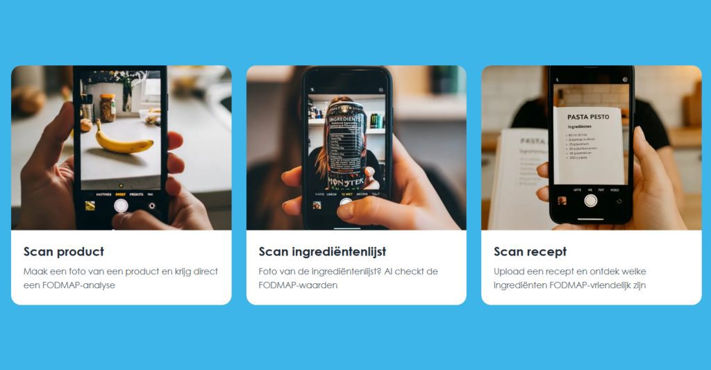 Herkennen – via de scan- en zoekfunctionaliteit die complexe ingrediëntenlijsten vertalen naar duidelijke FODMAP-informatie. Met de scanfunctie kunnen cliënten een product etiket of recept uploaden of scannen. De app analyseert ingrediënten en vertaalt deze naar begrijpelijke informatie binnen het FODMAP-dieet en het persoonlijke intolerantieprofiel.